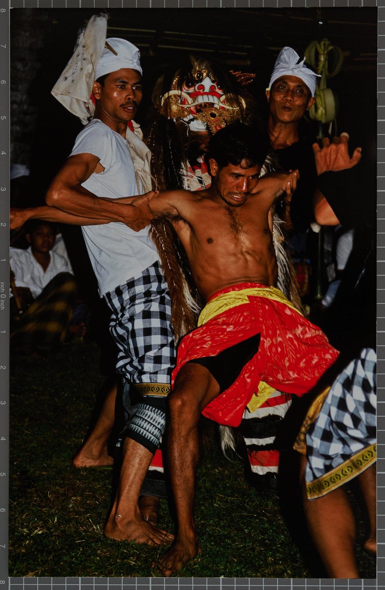 In an altered state of consciousness, a devotee awaits the blade. Rangda holds it, standing behind him. Reproduction by Gill Marais.