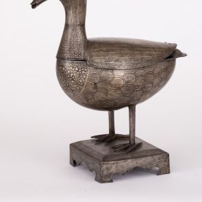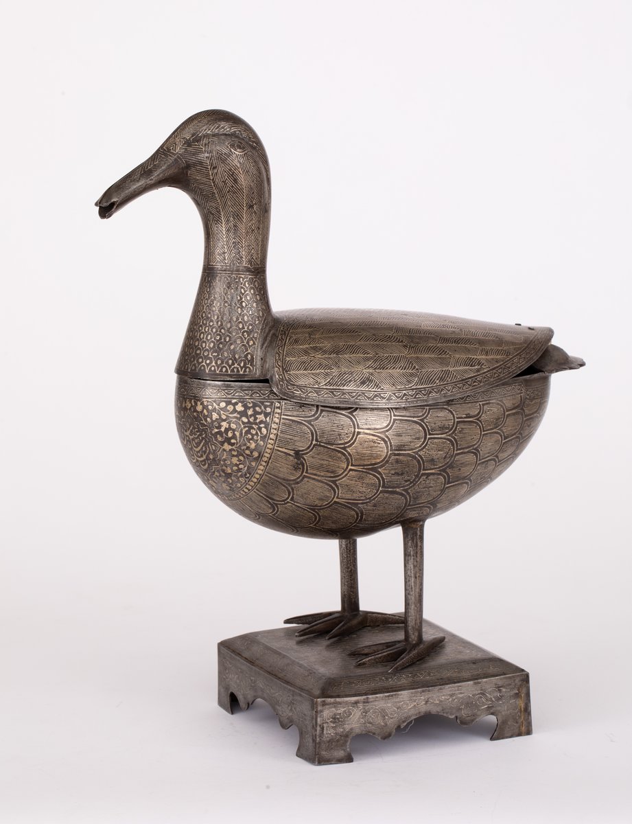 The body is covered with a dense, tawny plant decoration. Arabesque in the middle, Persian inscription in the middle. herringbone pattern on the head.