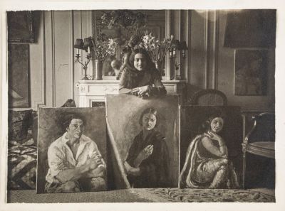 Amrita in the salon of their home in Paris, with her paintings