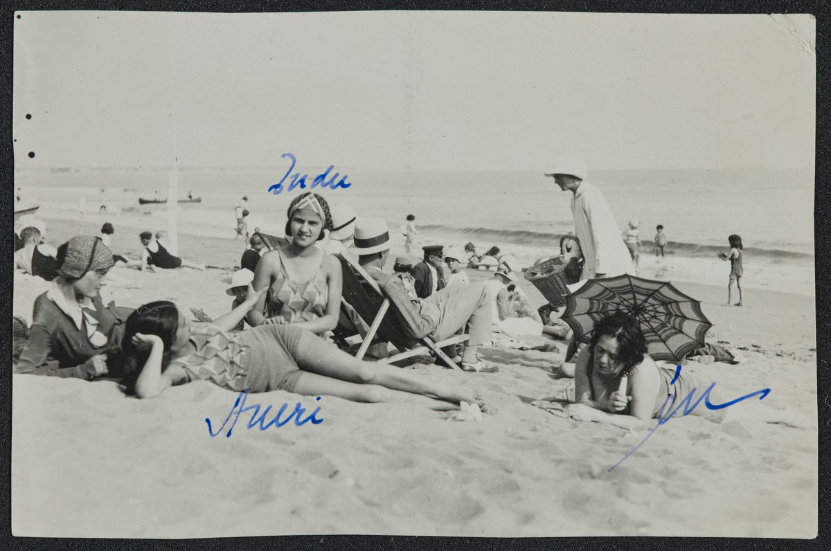 The ladies lie in their bathing suits on the beach sand, their names written in letters above them. Marie-Antoinette is under a parasol.