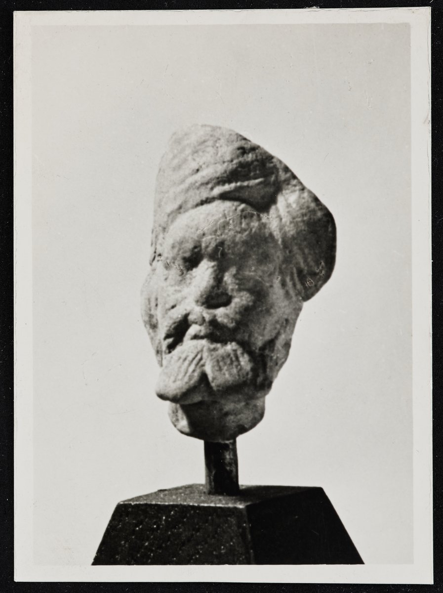 Presumably a fragment of a head related to the Gandhara material of the Indian Collection, with a beard opening in two directions and a pleated headpiece. There are traces of glue on the back wall of the black and white photo, it could probably have been glued on earlier.