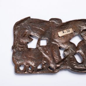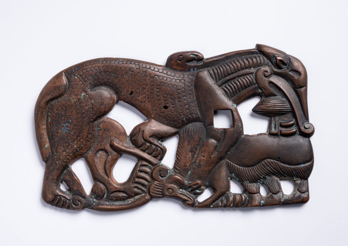Open-work plaque without border, depicting animal figures in motion. A tiger, turning towards the left, holds a yak beneath its forelegs and bites into its rump. The tiger’s body is decorated with tiny rows of dots, and the head of a bird (falcon) can be seen above the base of its neck.