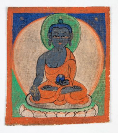 In a red frame on a green background, you can see the figure of the blue colored Bhaisajaguru (Mongolian: Otoch Manal) with the corresponding attributes. With inscription on the back.