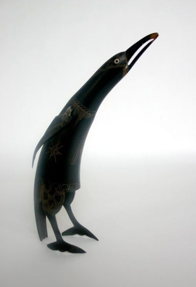 A bird figurine carved from buffalo horn, which can be assembled in several pieces. His sculptor has carved realistic and unrealistic figures on the neatly curved trunk, such as the "tie" hanging from the neck or the delicate lacework of the bird feathers.