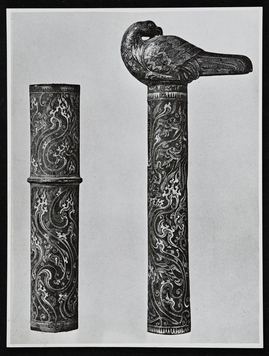Black and white paper image of a cylindrical metal artifact decorated with a bird turning its head back, mythical creatures and animals. The object in the photo is probably of Chinese origin. Ld.F.2024.728.1-3