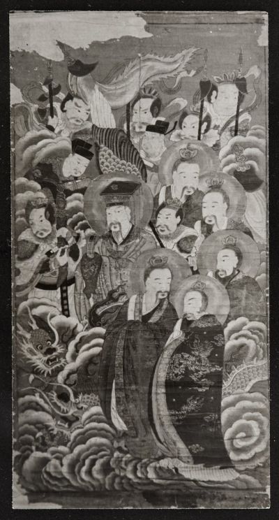 Black and white photograph of a painting depicting a celestial assembly. In the picture, figures in official clothes and figures in long ceremonial robes and aureole around their head, accompanied by a dragon. Similar images: Imre Patkó - Miklós Rév: The Art of Vietnam. Budapest, Corvina Publishing House, 1967.