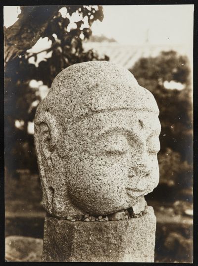 Unknown: Stone Buddha head on stone pillar. Korea (?), 1910-1920 - collected photograph