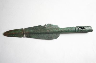 Long, leaf-shape, socketed spearhead with ribs along its blade. Two holes and a decoration of double lines are visible on its socket. Its blade is broken, there are casting failures on its socket.