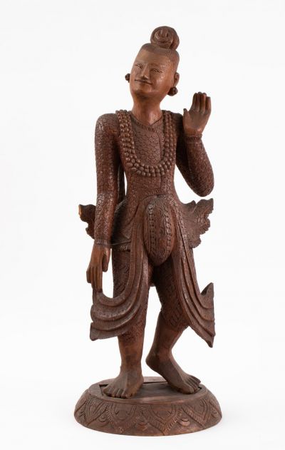 This figure, which may represent a dancing figure, is a figure with a particular hand posture (perhaps nat - a god or demigod figure in Burmese religious practice, a remnant of pre-Buddhist spiritual beliefs still alive today. This assumption is reinforced by the foot in motion. Burmese sculpture often depicts a few pieces, and the present object is a pair of pieces under inventory number 58.190.