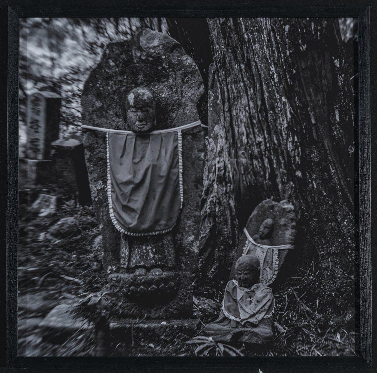 At the base of a large tree are three stone statues decorated with cloth, and further away are memorial stones with inscriptions on them.