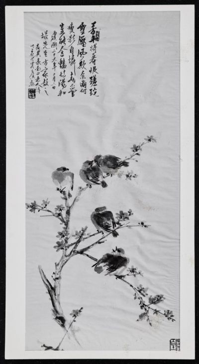 A flowering branch with five small birds. In the lower right corner of the scroll image, with jezl, in the upper left corner with Chinese inscription.