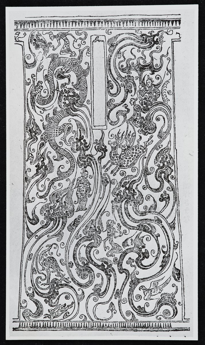 Black and white photo of ornamental graphics decorated with Chinese dragons, birds, animals and mythical creatures. In the upper third of the depiction it is divided vertically into two parts.