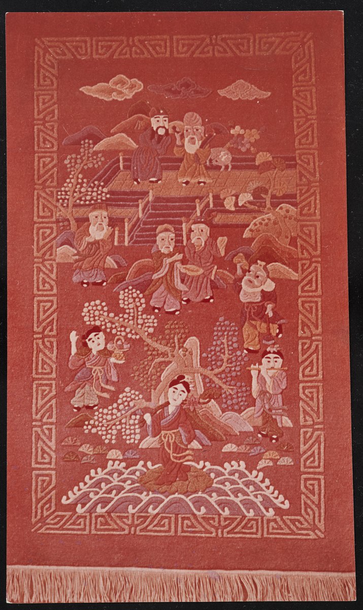 Color photo of a figurative carpet. In the geometrically framed scene, figures in cloaks appear in three lanes next to each other, among built and landscape motifs.