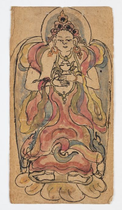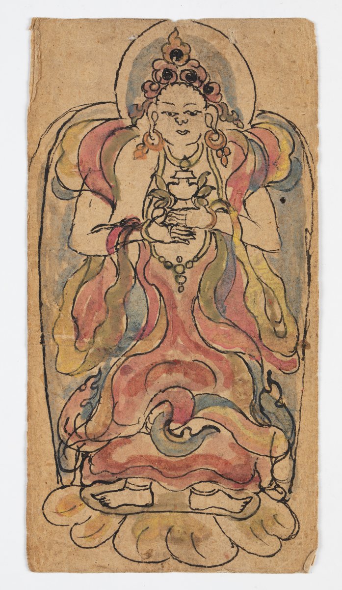 Part of the series (98.5.1--98.5.5) depicting deities representing the Five Elements (t.: 'byung ba lnga). A female figure drawn on Chinese paper and colored with natural watercolors, with the name of the goddess on the back: Metal (t: lcags).