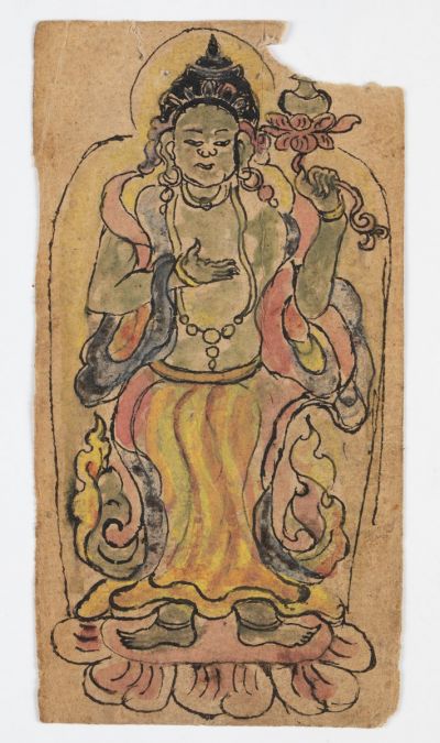 Part of the series (98.5.1--98.5.5) depicting deities representing the Five Elements (t.: 'byung ba lnga). A female figure drawn on Chinese paper and colored with natural watercolors, with the name of the goddess on the back: Wood (t: shing).