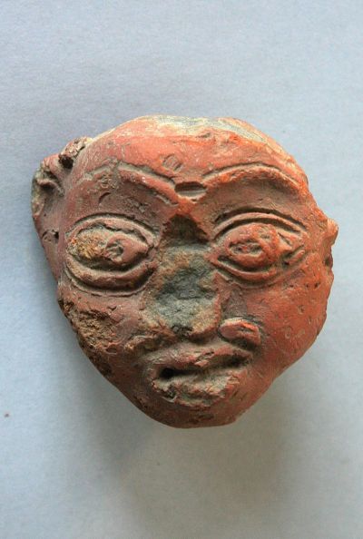 Fragments of a statuette, low forehead, raised eyebrows, large protruding eyes, nose broken off, traces of a mustache are visible. The right ear is partially saved.