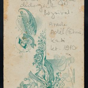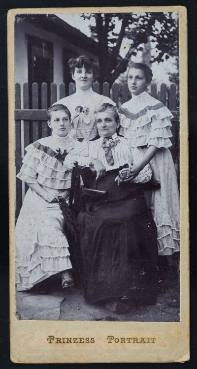 Portrait photograph of Mrs. György Szinell (née Adél Czenner) with her daughters: Aranka, Adél, Kati.