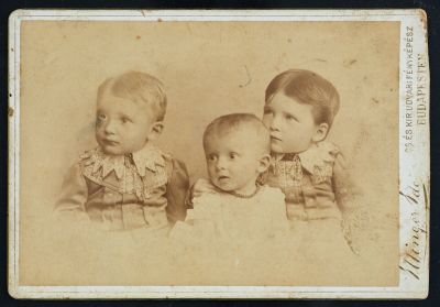 Portrait photograph of Szinell children. János Szinell (1889-1944), Ferenc Szinell (1890-1956), Adél (Etus) Szinell (1888-1964).