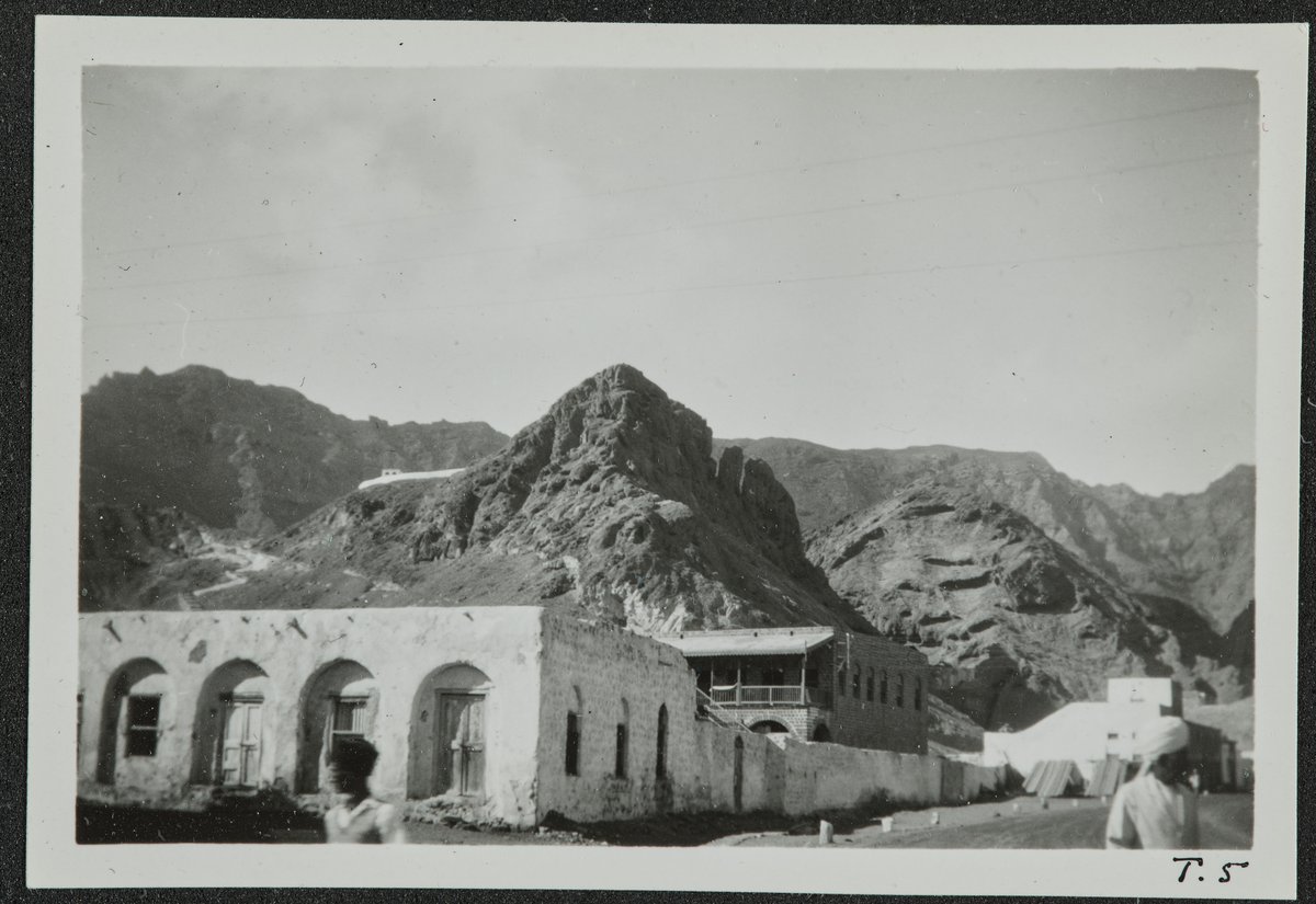 Flat-roofed houses at the foot of barren rocky mountains