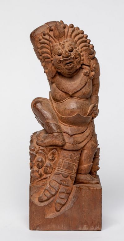 Carved wooden figure of a fanged gatekeeper (dvarapala) with demonic features. He holds a mace in his right hand, which is raised above his head and bent, while his left hand rests on the hilt of a sword slid into his belt. His right foot makes a stepping motion. The object belonged to the collection of Ernő Zboray.
