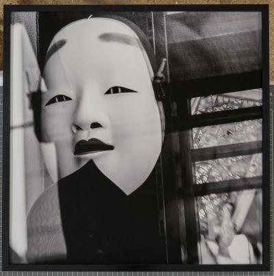 A Noh mask representing a young woman behind glass: something is being reflected in the glass on the far left, and a barred window can be seen behind.