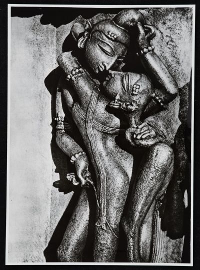 They are standing male and female figures with delicately cut faces, with large, almond-shaped narrow eyes, round strings of pearls in their hair on their arms and wrists. Their lips are approaching each other. Detail of a statue or relief.