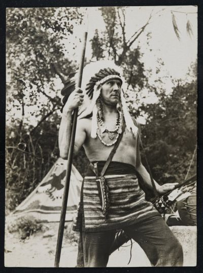 Indian chief Ervin Baktay wearing a dagger in front of a tent