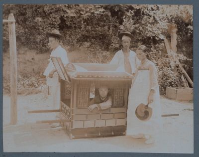 The album containing Dezső Bozóky's travelphotos (second). Related item: A.4760.2. (album). Unknown photographer. Photograph purchased by Dezső Bozóky. Well-off Koreans traditionally travelled on horse or in palanquins, with the entourage following the master or mistress on foot. Sitting in this palanquin is not a lady but a singer (gisaeng), who could be persuaded for a photo. Standing by the litter is her servant, while