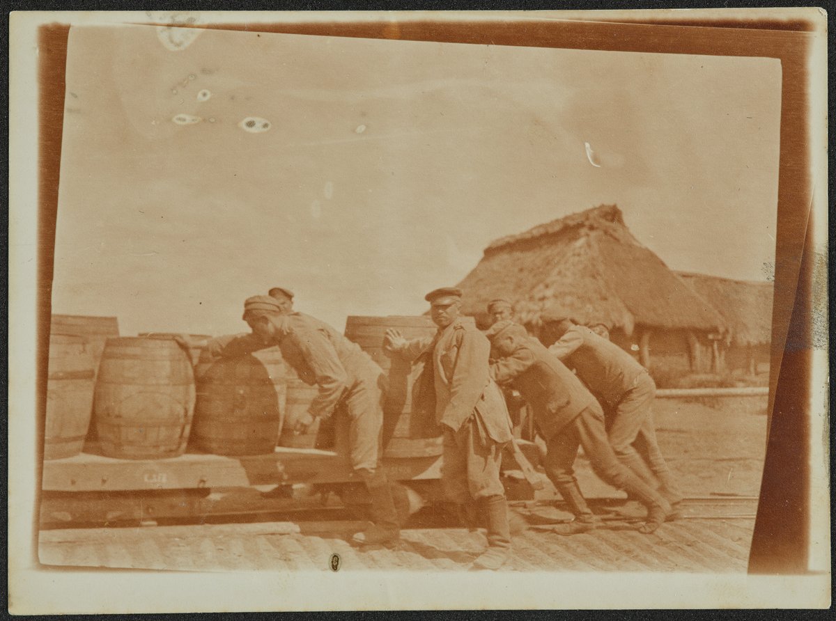 Lajos Schöne's bequest: Photographs from World War I. Soldiers push a wagon loaded with barrels
