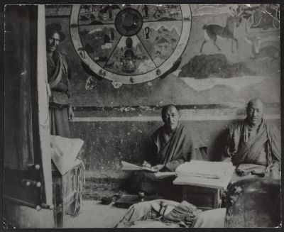 Lamas of the reformed sect, image of the wheel of life on the wall, Ladakh, 1928
