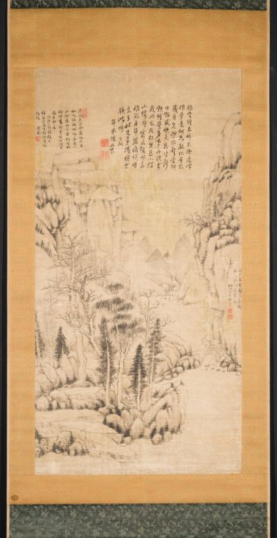 Yang Ting, beside being a literary man, was a painter of cliffs. His painting depicts a landscape of early spring with steep mountainsides on each side. Upwards on the left, there is a multi-storey wooden building. A bridge spans the river on the right. Two colophons are on the painting. The middle one is written by Chen Danzhong, the left one is made by Zhou Huang.