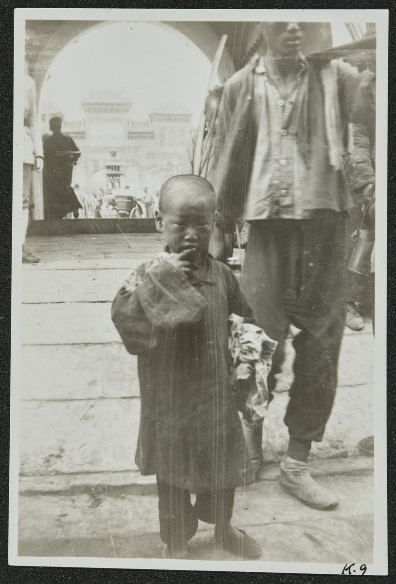 Life on the street in front of the main gate: a little boy with rags in his hands, a man with a carrying pole on his shoulder, Beijing