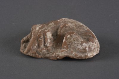 The figure depicts a lying, curled-up dog. Its head is resting between its outstretched legs; it has pulled its tail to its body. The red earthenware body was covered with slip; by now, most of it has wore off. Ceramic figures of dogs often occur in the Han period (206 BC–220 AD); glazed and unglazed variations are both known