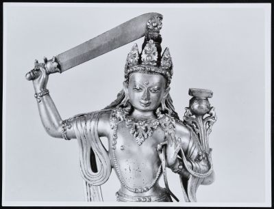The inv. Black and white detail photo of the statue of Manjushri Bodhisattva 79.43.1, preserved in the Mongolian Collection. Description of the artifact: Manjushri Bodhisattva (Mongolian: Manjusiri; Sanskrit: Mañjuśrī; Tibetan: 'jam dpal) holds a lotus flower and that sword in his hand, going to cut off ignorance. He wears princely robes and bodhisattva ornaments. He sits on a triangular lotus throne with a convex wall in a meditative posture. The lotus throne is divided into five parts, decorated with upward curved lotus petals and notches. The statue, which shows the characteristics of the style, can be considered the work of either Dzanabadzar himself or his school. It dates back to the 17th and 18th centuries, creator: Öndör Gegén Dzanabadzar Gombodorjin
