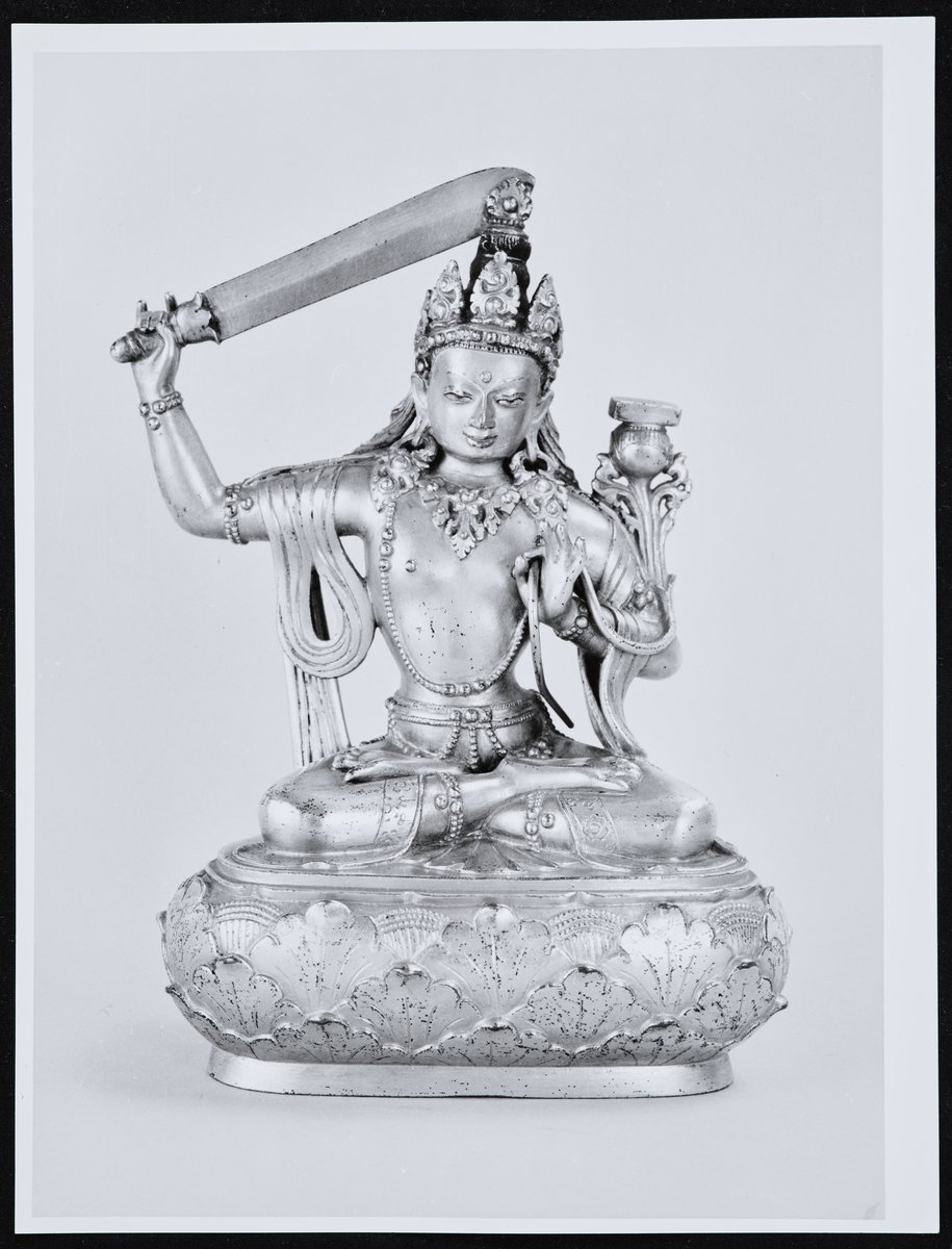 The inv. Black and white photo of the statue of Manjushri Bodhisattva 79.43.1, preserved in the Mongolian Collection. Description of the artifact: Manjushri Bodhisattva (Mongolian: Manjusiri; Sanskrit: Mañjuśrī; Tibetan: 'jam dpal) holds a lotus flower and that sword in his hand, going to cut off ignorance. He wears princely robes and bodhisattva ornaments. He sits on a triangular lotus throne with a convex wall in a meditative posture. The lotus throne is divided into five parts, decorated with upward curved lotus petals and notches. The statue, which shows the characteristics of the style, can be considered the work of either Dzanabadzar himself or his school. It dates back to the 17th and 18th centuries, creator: Öndör Gegén Dzanabadzar Gombodorjin