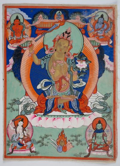 Thangka depicting Manjusri Bodhisattva (Tib.: 'Jam dpal', Mong.: 'Zuulun Egshigt') surrounded by his four emanations.