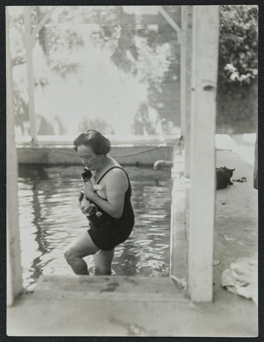 Marie-Antoinette stands on the steps of an indoor pool in a bathing suit, holding a kitten in her arms.
