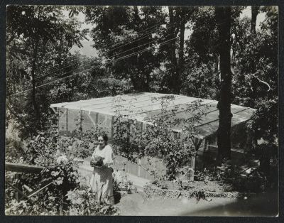 An indoor swimming pool among trees. In front of it, Marie-Antoinette in a long dress.