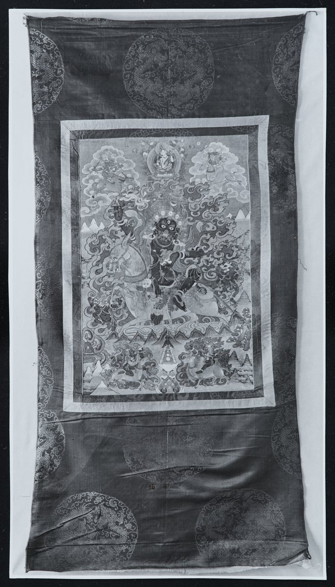 A photograph of a picture painted on a textile depicting a deity on a horse, wearing a skull crown, appearing in front of flames, depicting a deity depicted with a third eye on his forehead, during restoration. The photo shows the condition before the restoration. The photo shows the entire painted textile picture, including the textile frame.
