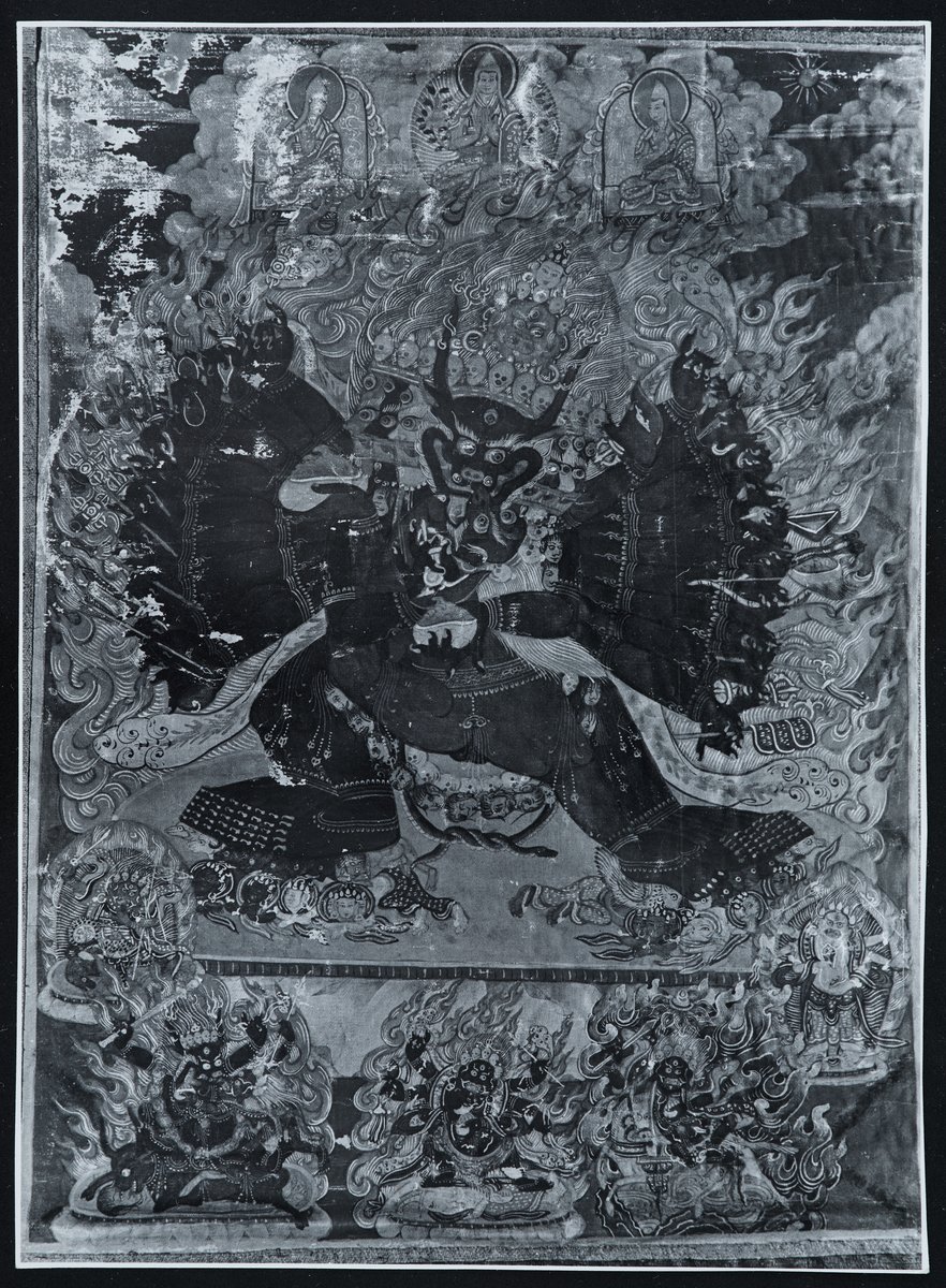 In the middle of the picture space, a photo painted on textiles depicting an angry deity with many legs, many arms, many heads, a tall crown inlaid with skulls and a snake made of human heads and skulls and entwined in its own body as a long necklace, during restoration. The photo shows the condition before the restoration. The photo shows the entire painted textile picture, without the textile frame. The damage and paint deficiencies are clearly visible in the picture.