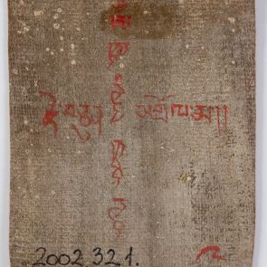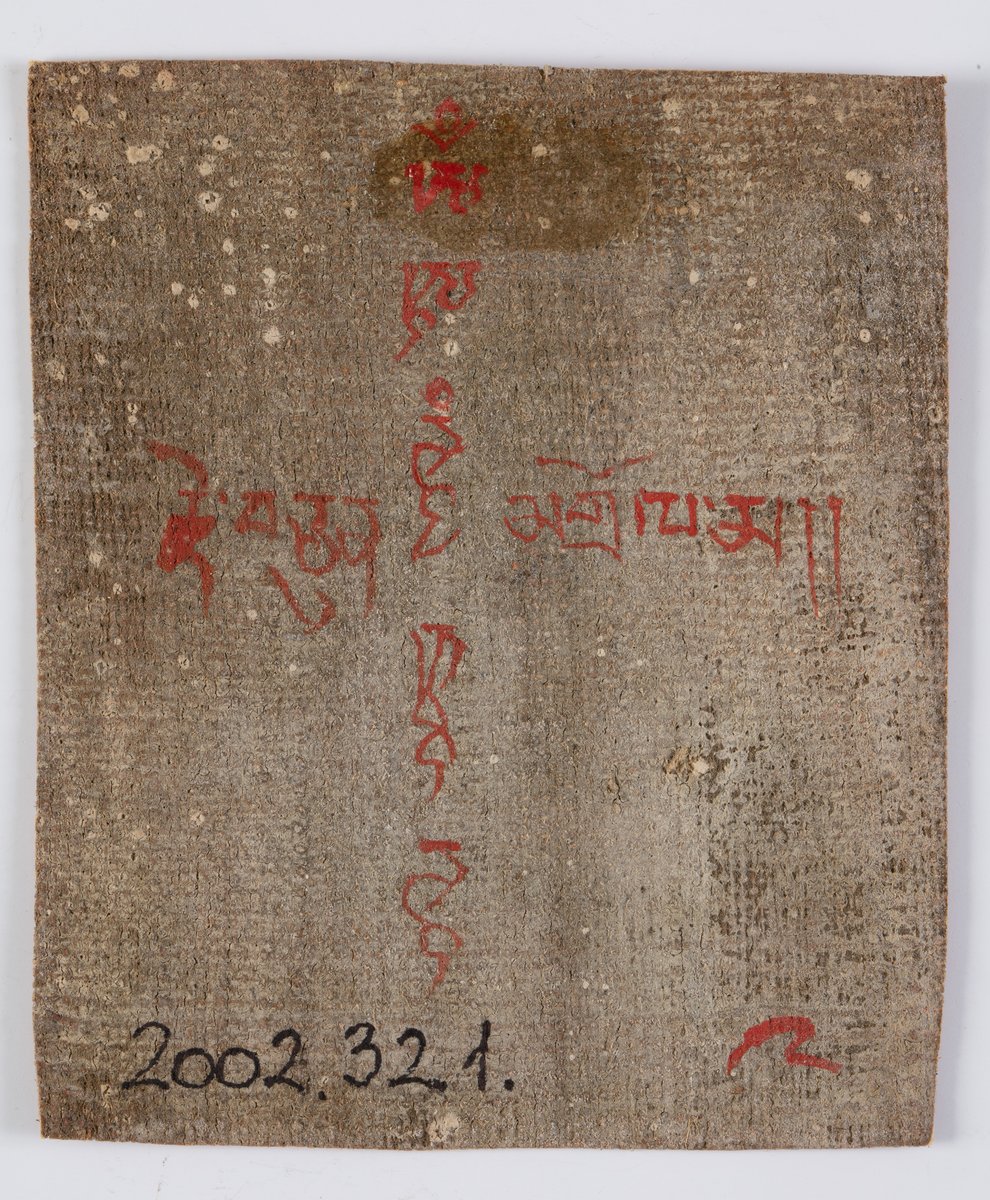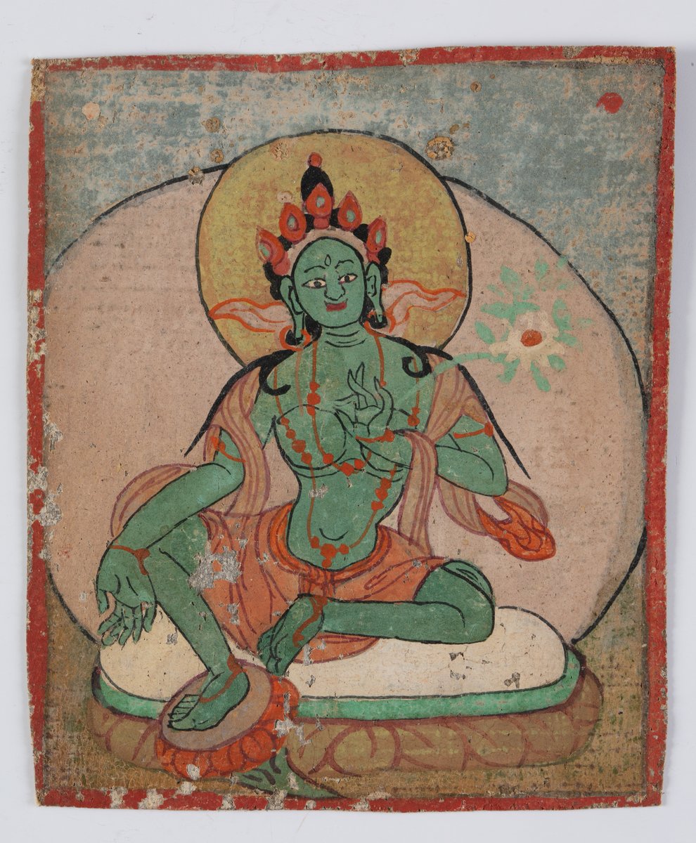The series depicting the "Twenty-One Tara Goddess" (Tibetan: sgrol ma nyer gcig ma) is incomplete. In this picture Tara's green-bodied figure with two arms, and on the back Tibetan inscription can be seen.
