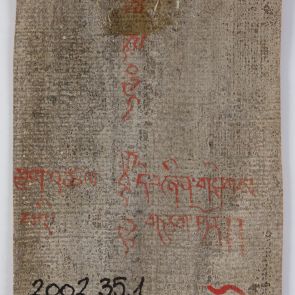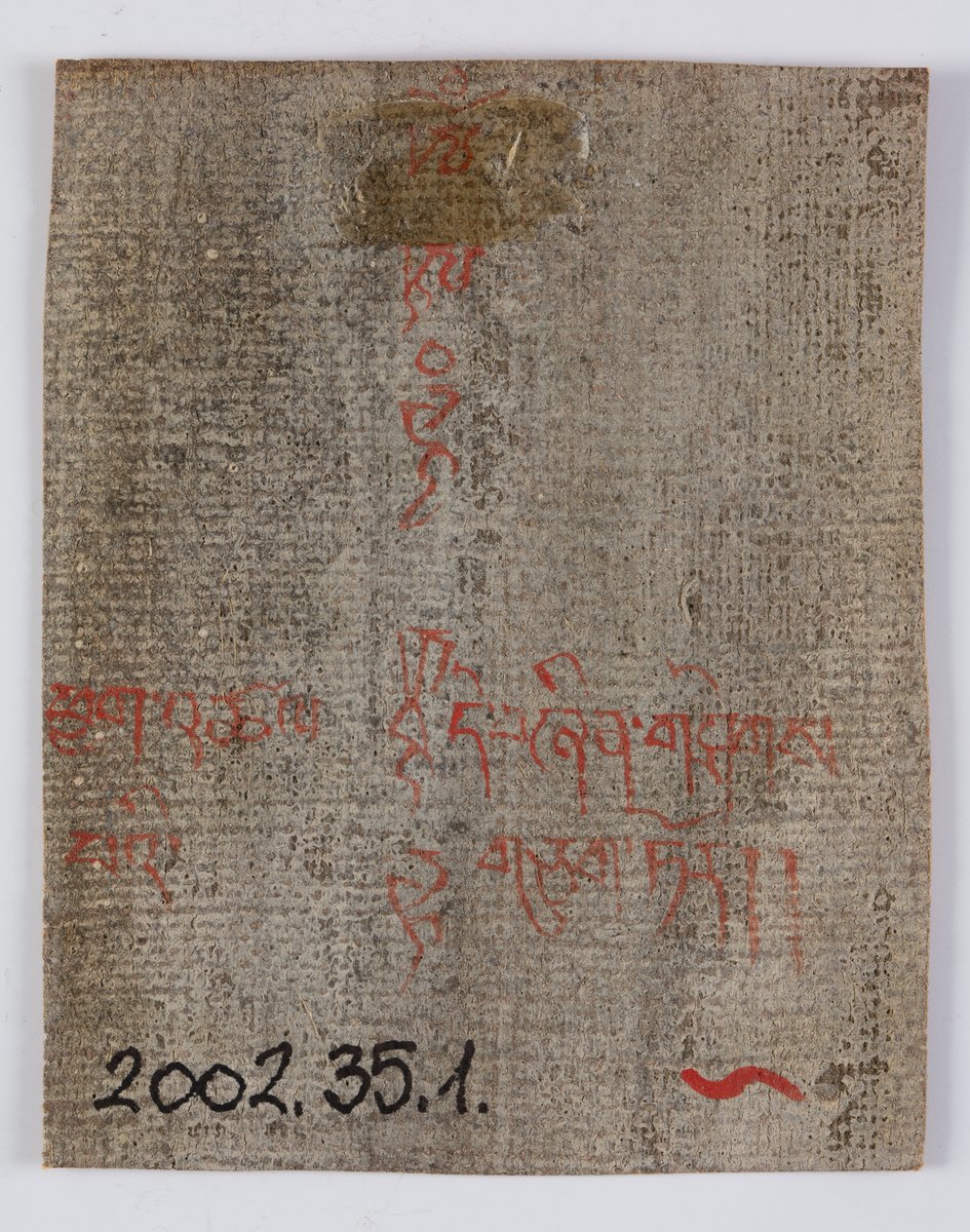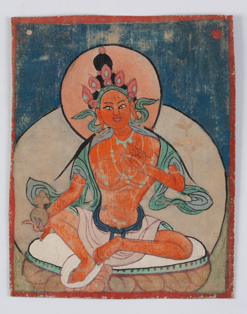 The series depicting the "Twenty-One Tara Goddess" (Tibetan: sgrol ma nyer gcig ma) is incomplete. In this picture Tara's orange-bodied figure with two arms, and on the back Tibetan inscription can be seen.