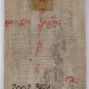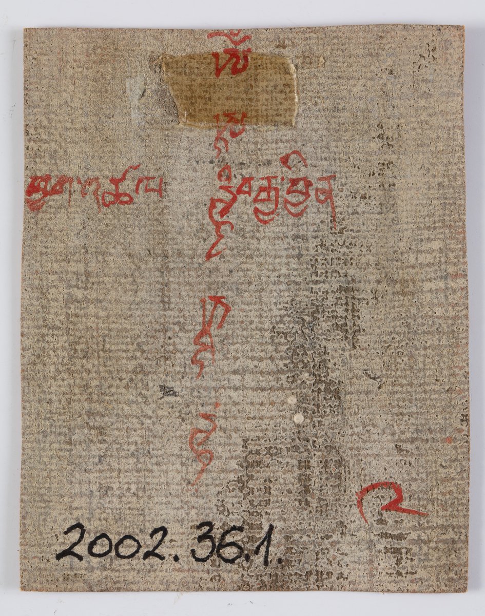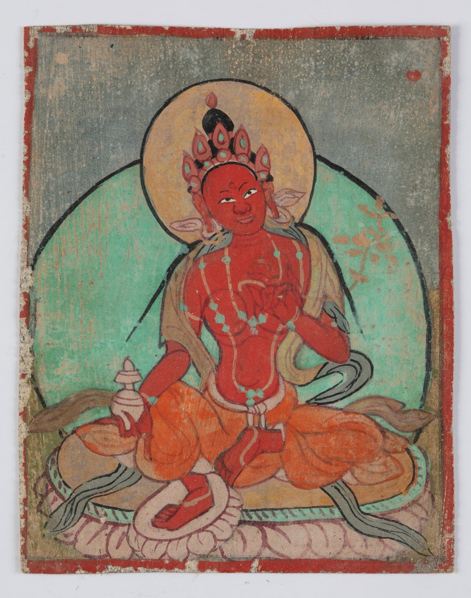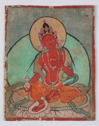 The series depicting the "Twenty-One Tara Goddess" (Tibetan: sgrol ma nyer gcig ma) is incomplete. In this picture Tara's red-bodied figure with two arms, and on the back Tibetan inscription can be seen.