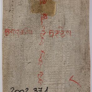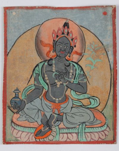 The series depicting the "Twenty-One Tara Goddess" (Tibetan: sgrol ma nyer gcig ma) is incomplete. In this picture Tara's blue-bodied figure with two arms, and on the back Tibetan inscription can be seen.