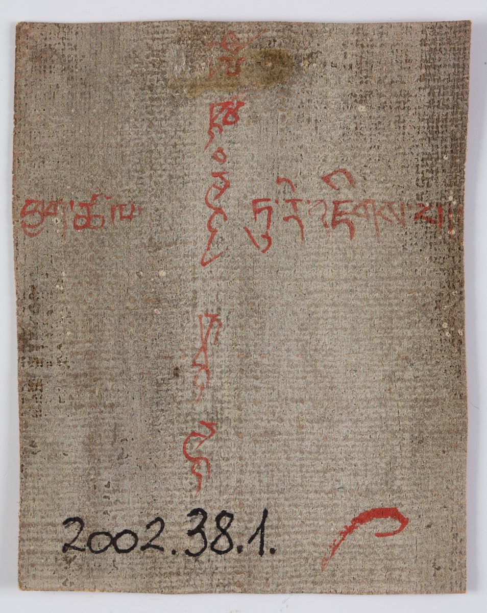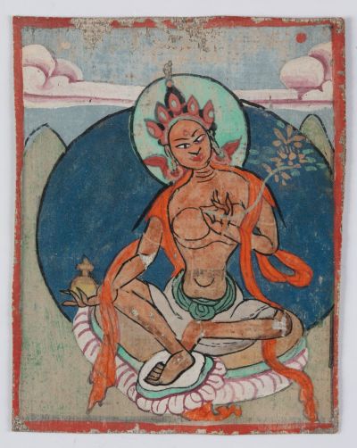 The series depicting the "Twenty-One Tara Goddess" (Tibetan: sgrol ma nyer gcig ma) is incomplete. In this picture Tara's orange-bodied figure with two arms, and on the back Tibetan inscription can be seen.