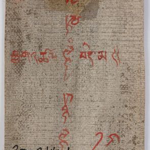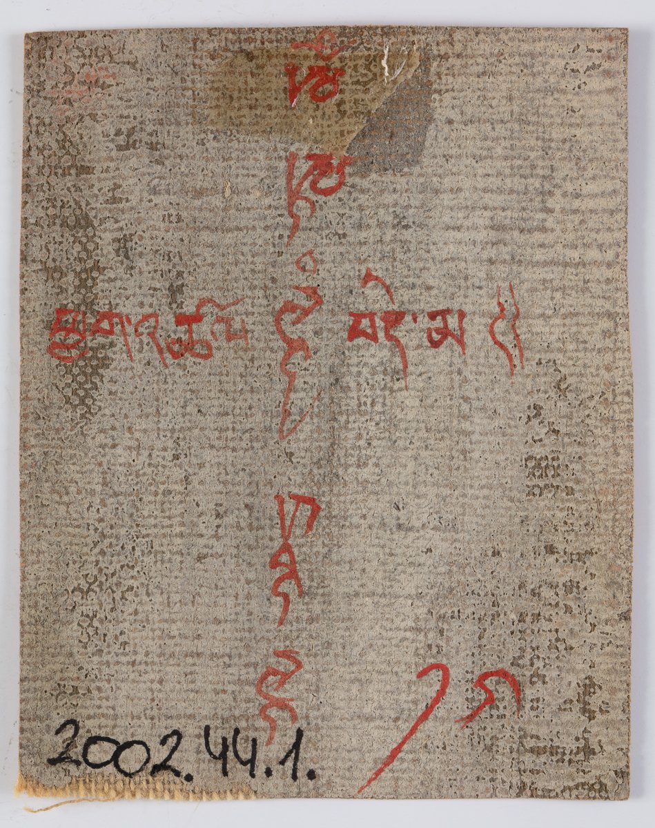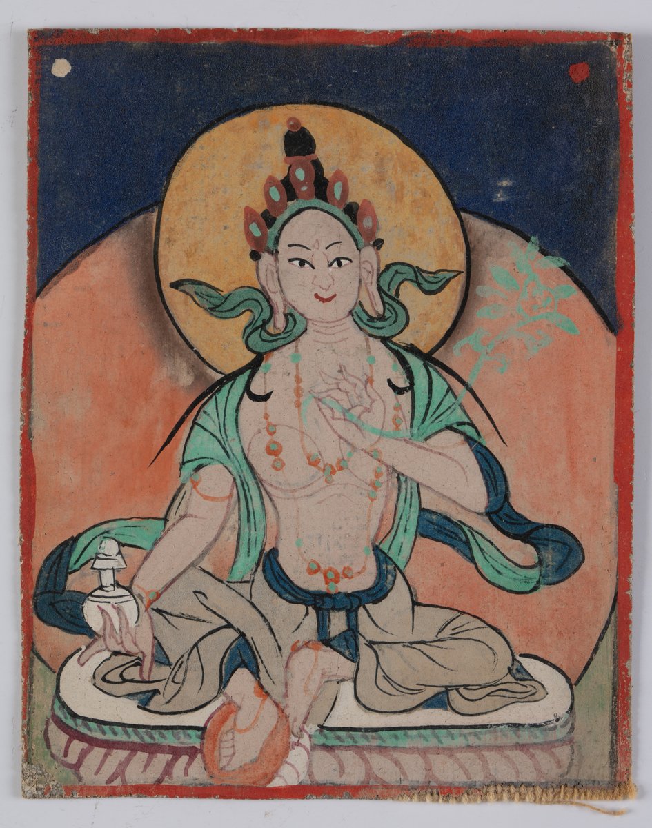 The series depicting the "Twenty-One Tara Goddess" (Tibetan: sgrol ma nyer gcig ma) is incomplete. In this picture Tara's white-bodied figure with two arms, and on the back Tibetan inscription can be seen.