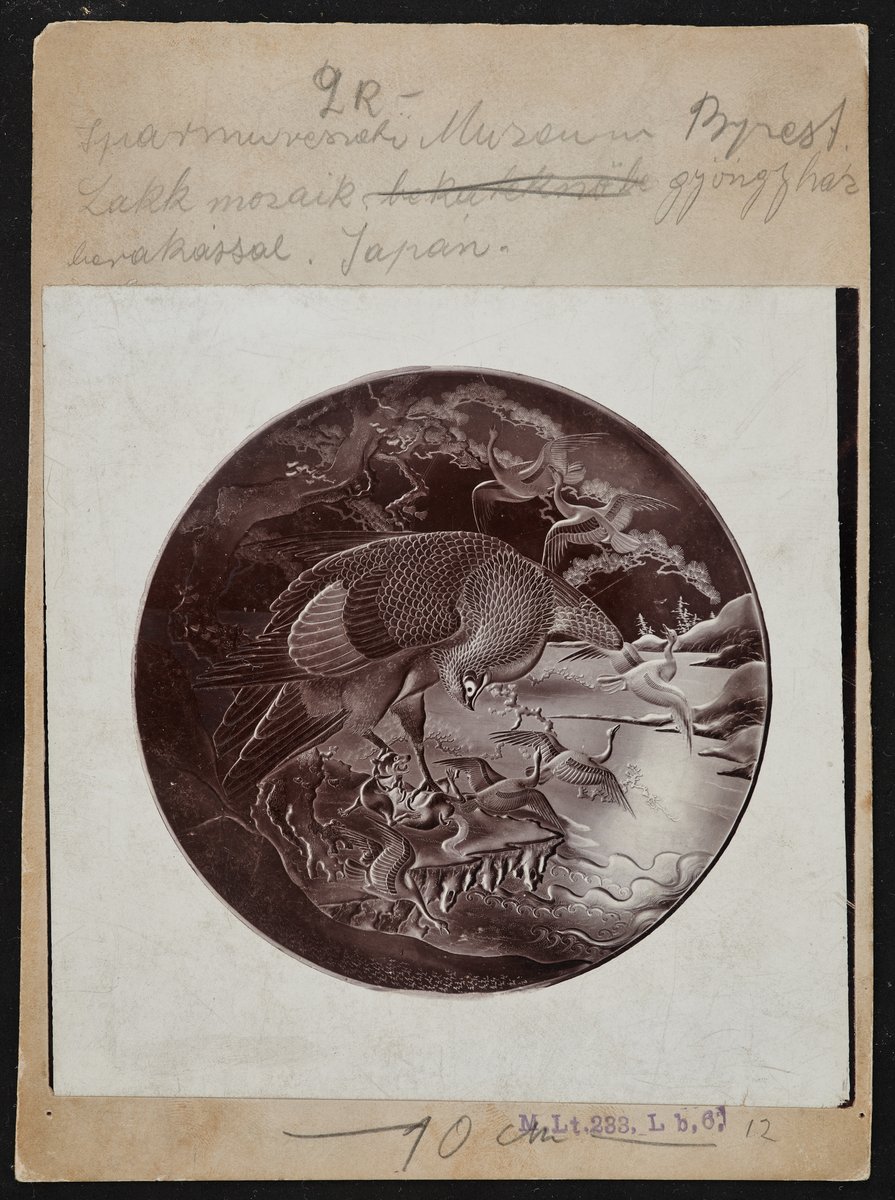 Photo of a round Japanese lacquered box with birds flying; one of them is grabed by a fox (?)
