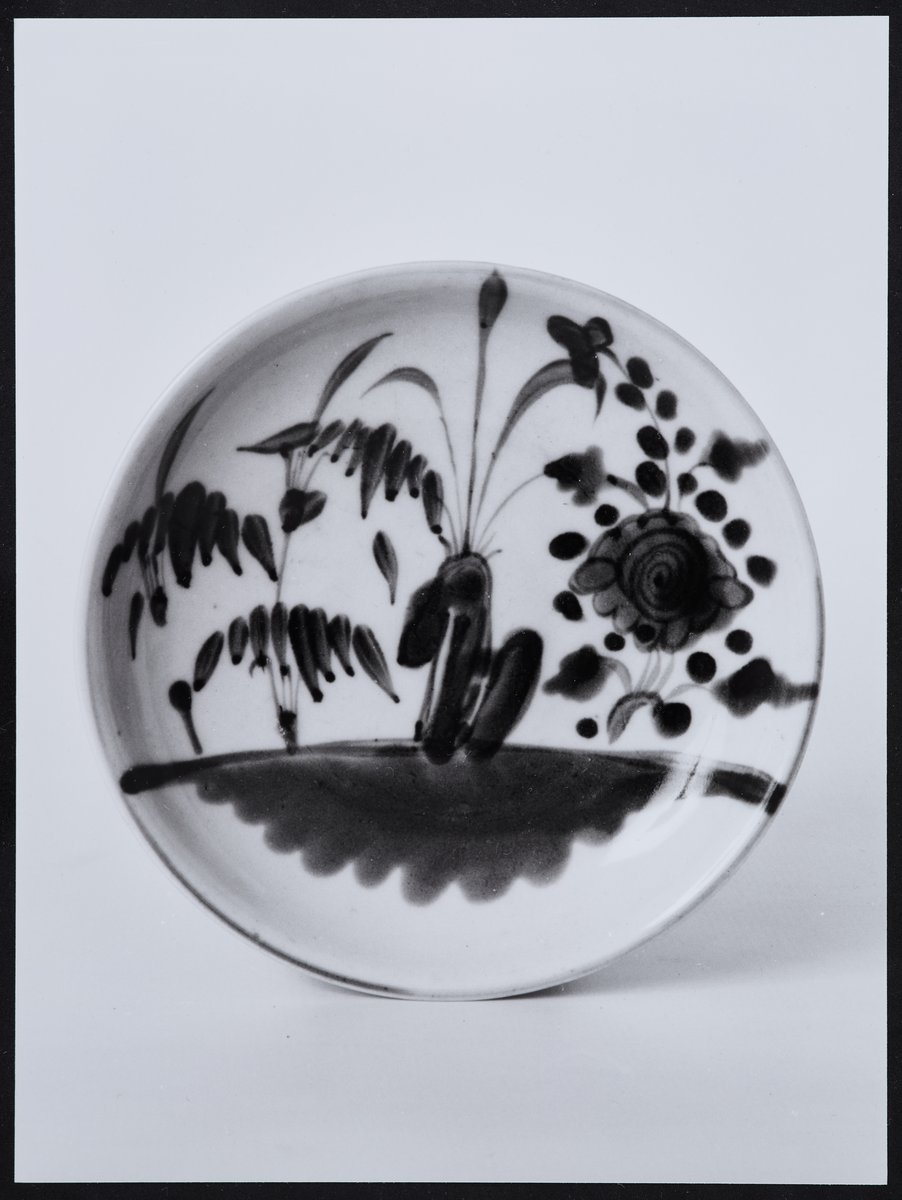 Black-and-white photo: Porcelain bowl with rock, flower, and bamboo decoration, 2002.