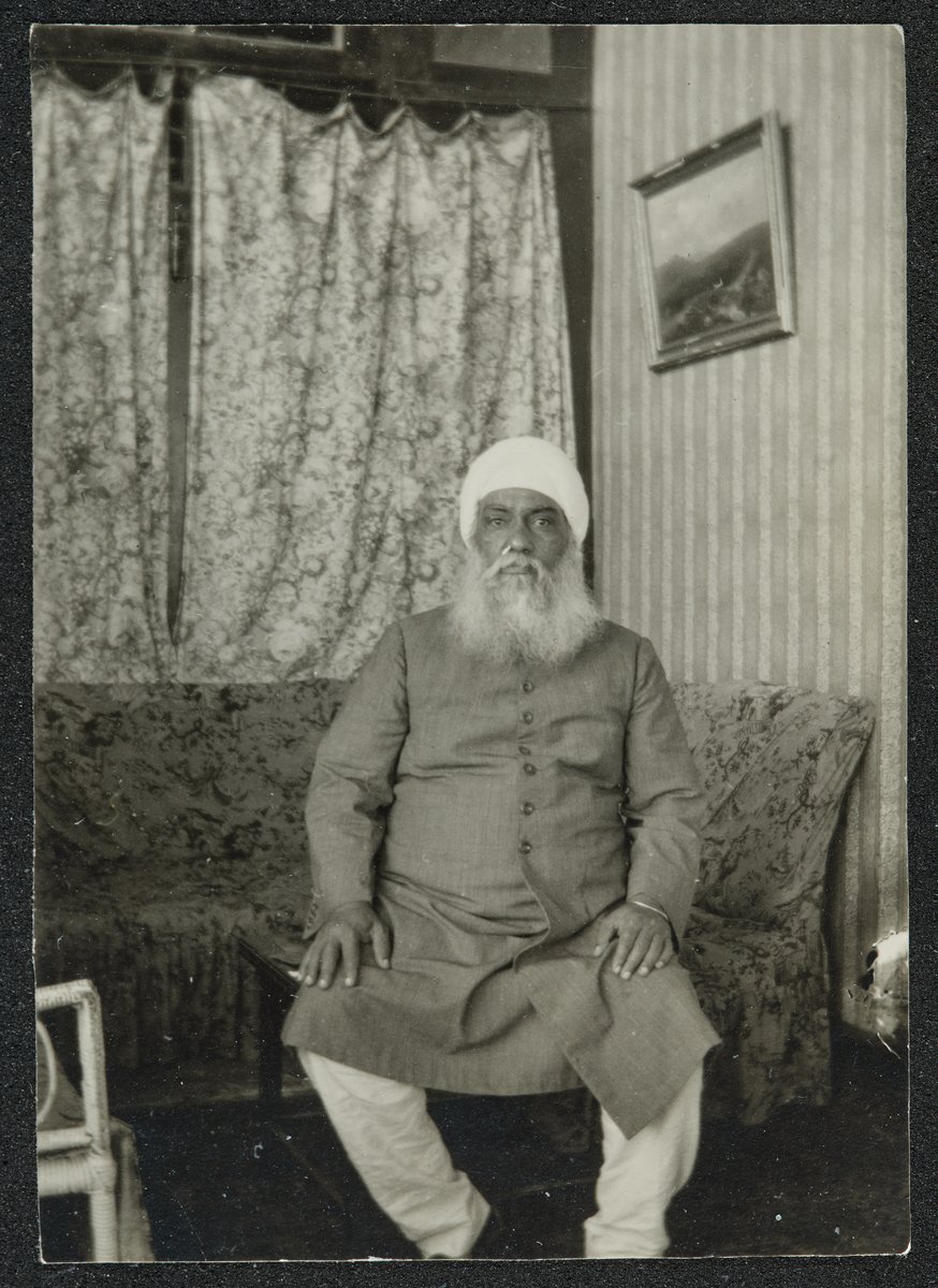 A slightly corpulent, bearded, moustachioed Indian gentleman, Umrao Singh's brother, faces the camera on a draped sofa, behind him a window covered with patterned curtains.