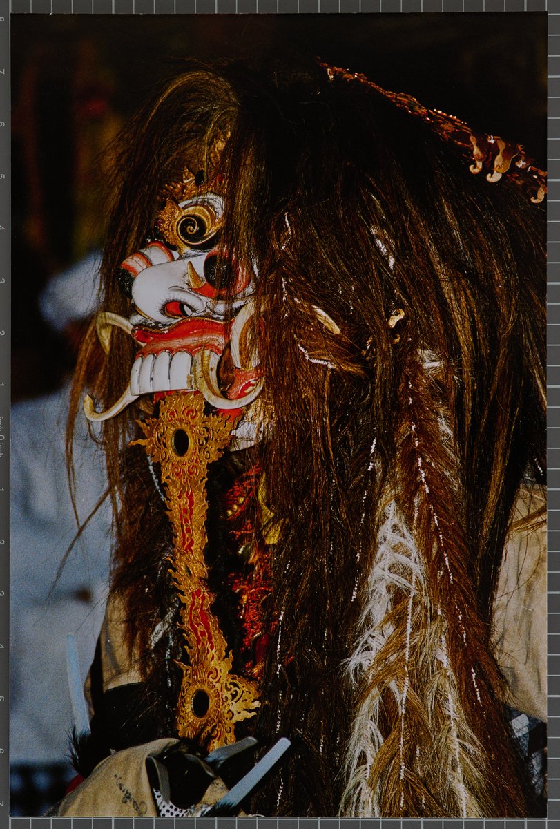 Performing with the mask requires significant stamina, as it weighs 12 kilograms. Like the goddesses, Rangda is escorted under a yellow parasol, and her path is marked with white fabric. The mask must not touch the ground. Reproduction by Gill Marais.